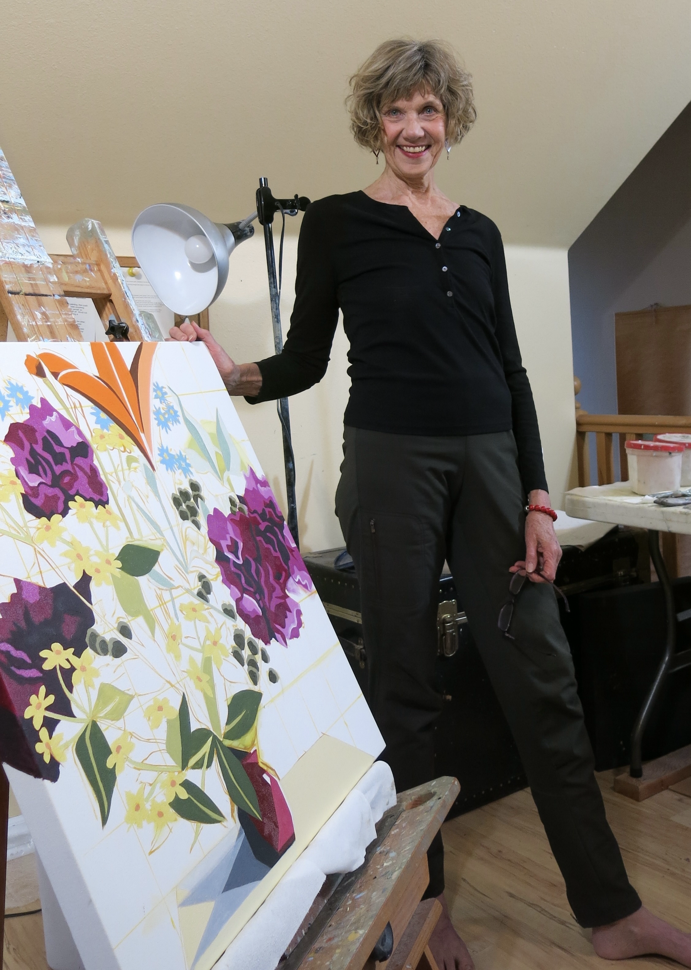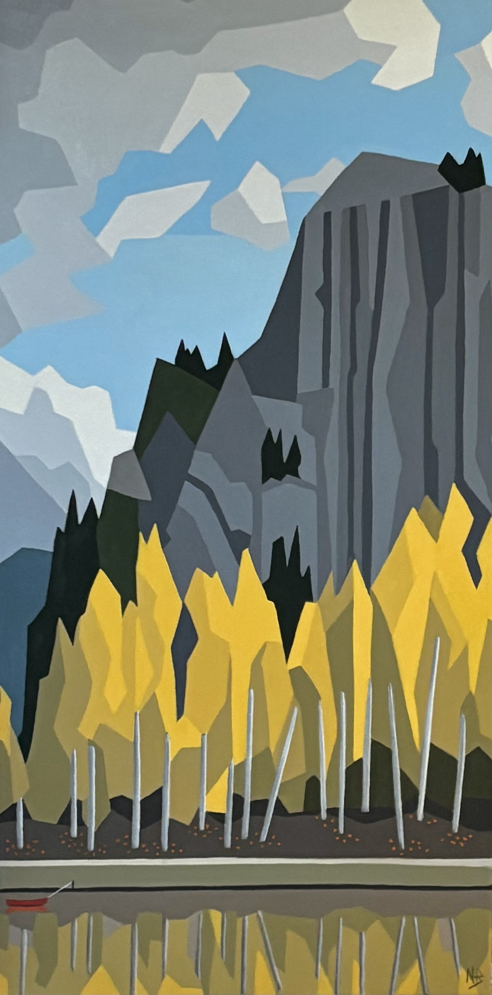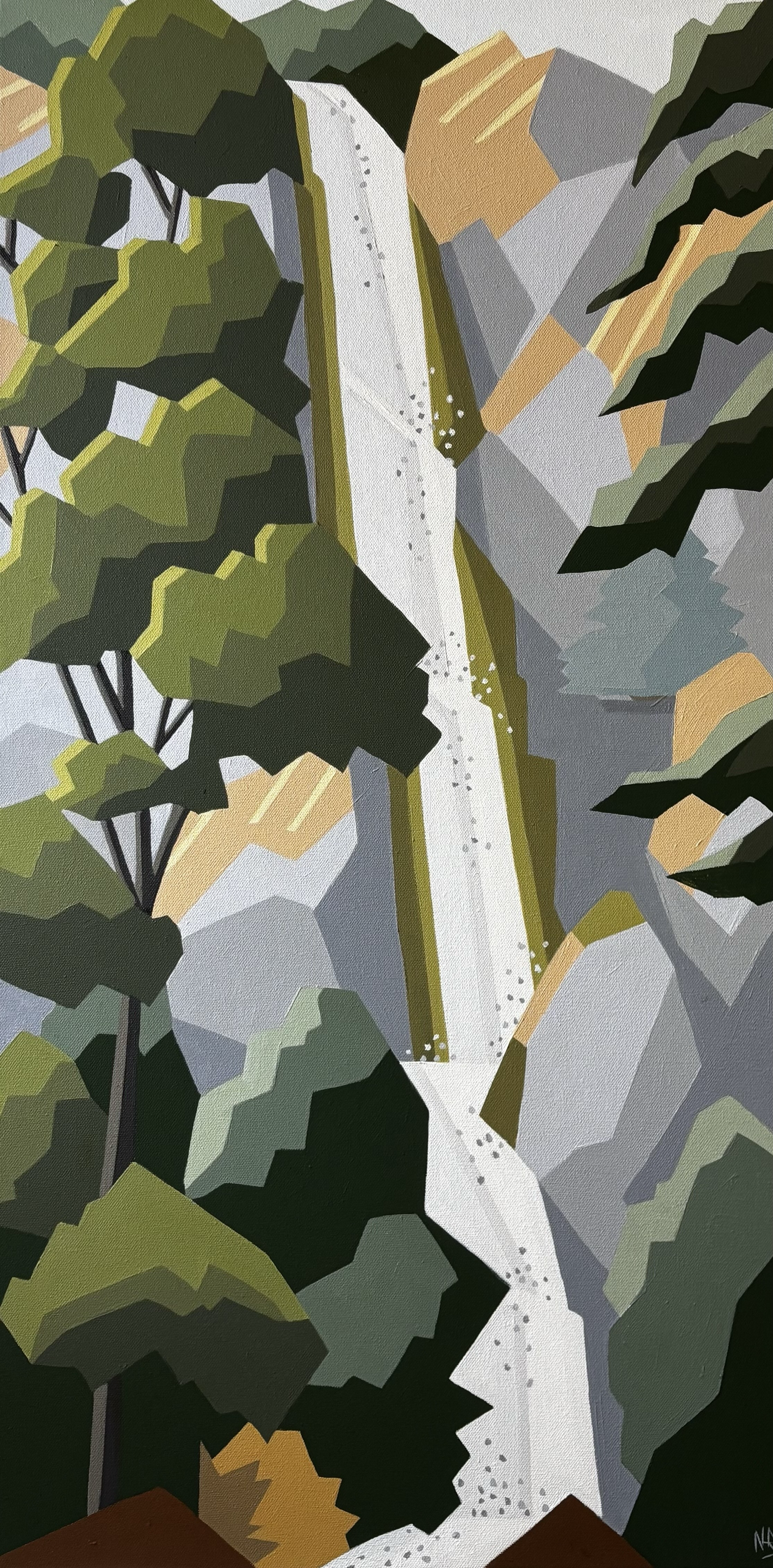 I paint in oil on both large and small stretched canvases. I'm primarily inspired by the landscapes of the Gorge: the river, the mountains, the agriculture. My pieces use flat abstracted geometric shapes, pushed perspective, and a touch of whimsy. I would like the viewer to enter into the painting to experience the pleasure of seeing the land in a new way.