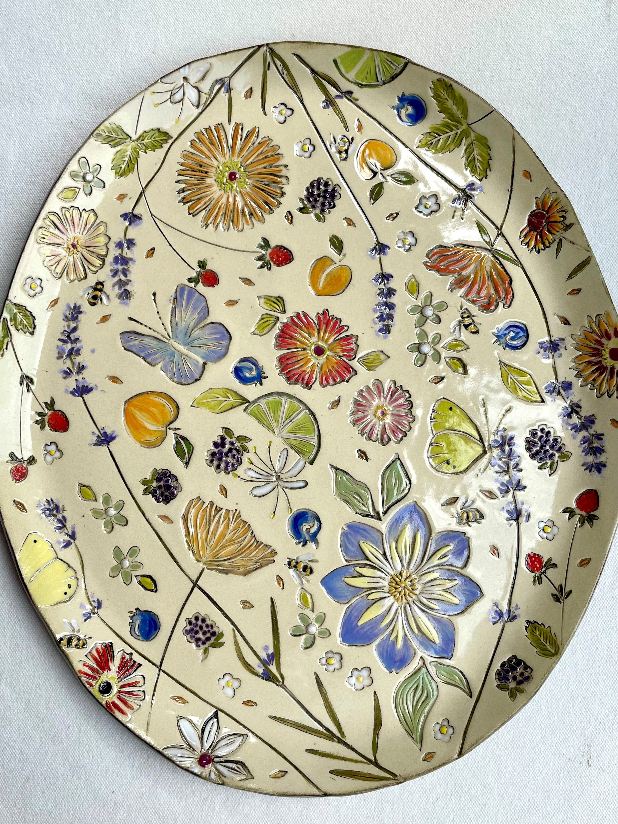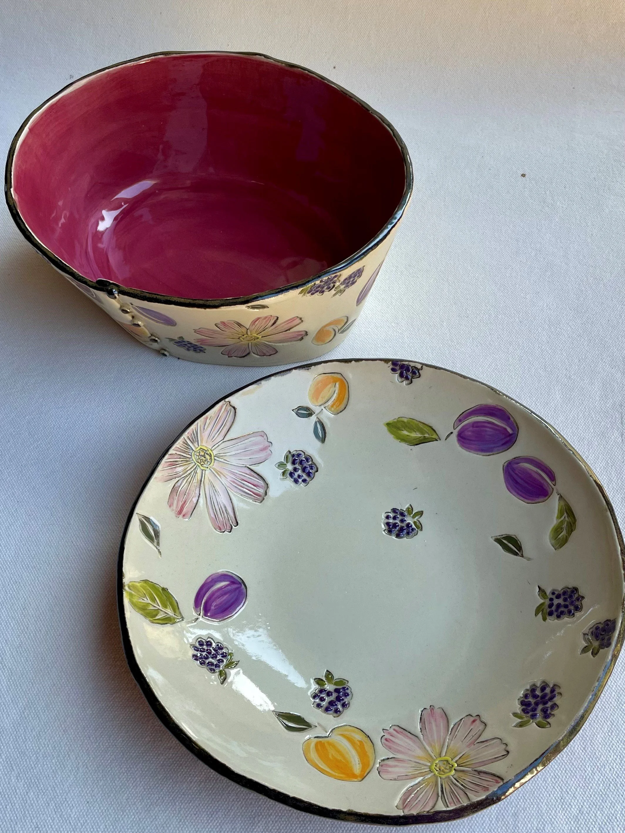 Throughout my 17-year pastry career and owner of Polly’s Cakes, I often thought, “when I grow up again I’d like to be a potter.” Inspired by gardens, Gorge flora and a love of surface design, I use a growing collection of my own hand carved stamps to imprint slab built clay creating one of a kind ceramic fabric for each piece. The final result is somewhere between a wood block print and a pressed botanical collage. Come see the process!