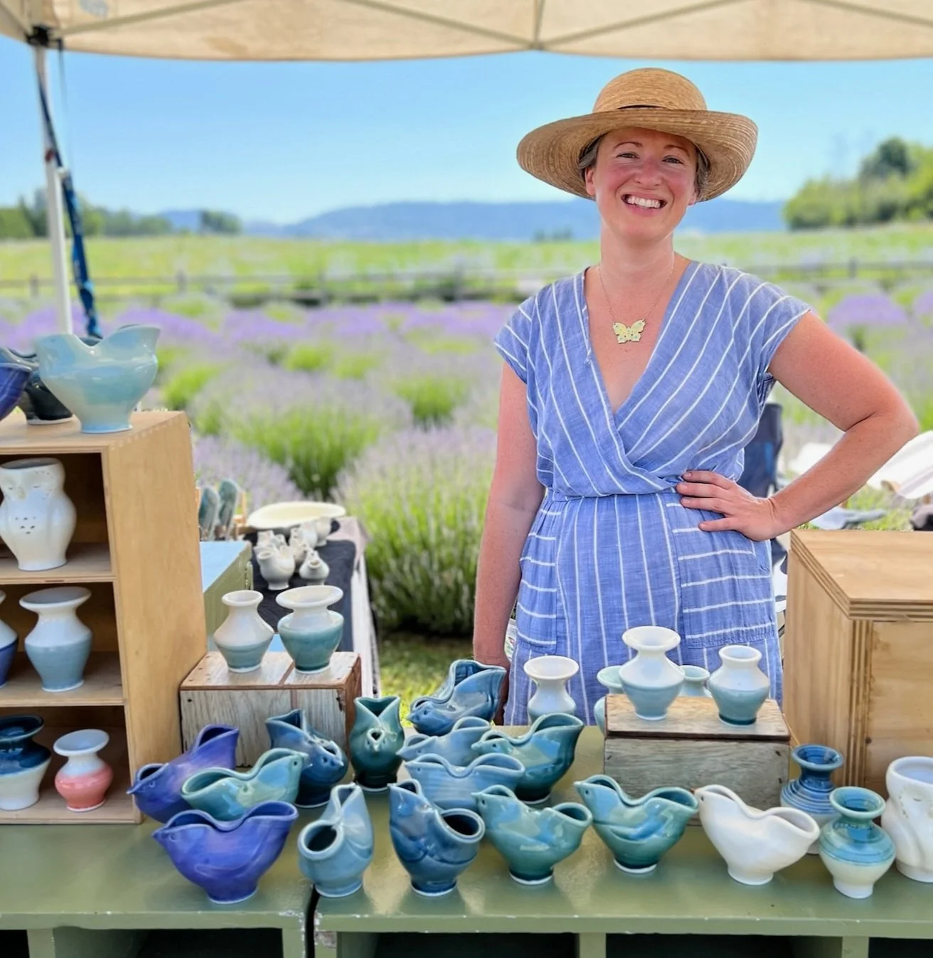 I am a studio potter working from the wheel and slab roller. I make holders of things; flower vases or dishes for meals, shaping eroded mountains which once held life to hold it again in different ways. Clay is amazing. I love to make thrown & altered bird forms. Hope to see you on the tour!
